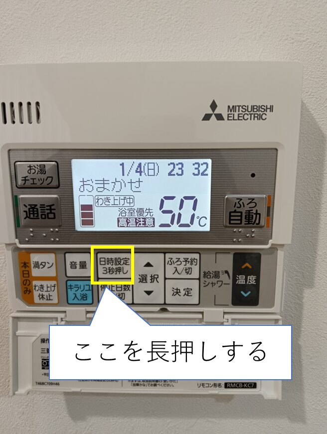 設定変更は以下の画像の通りです。日時設定を長押しして時刻変更を行います。